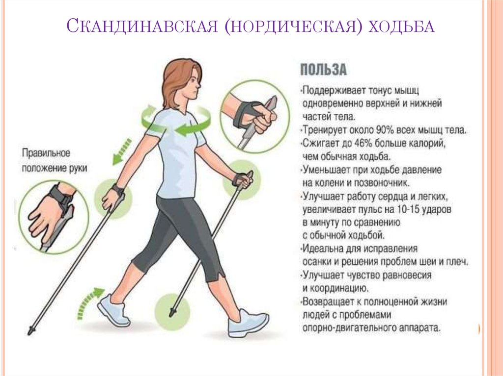 - Скандинавская ходьба, которая включает использование палок для тренировки верхней и нижней части тела