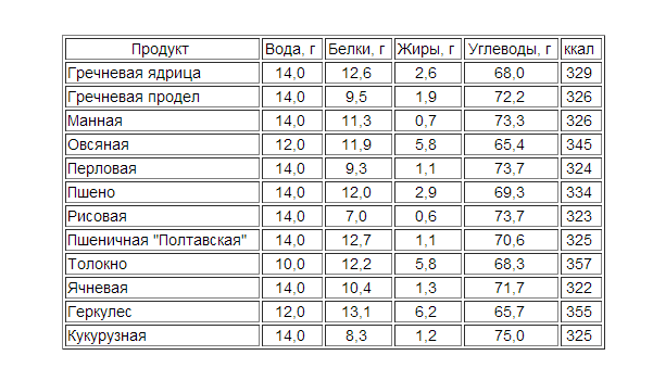 В таблице приведены ориентировочные цифры. Питательная ценность 100 грамм готовой каши, приготовленной на воде и без добавления масла, как правило, не превышает 110 ккал.
