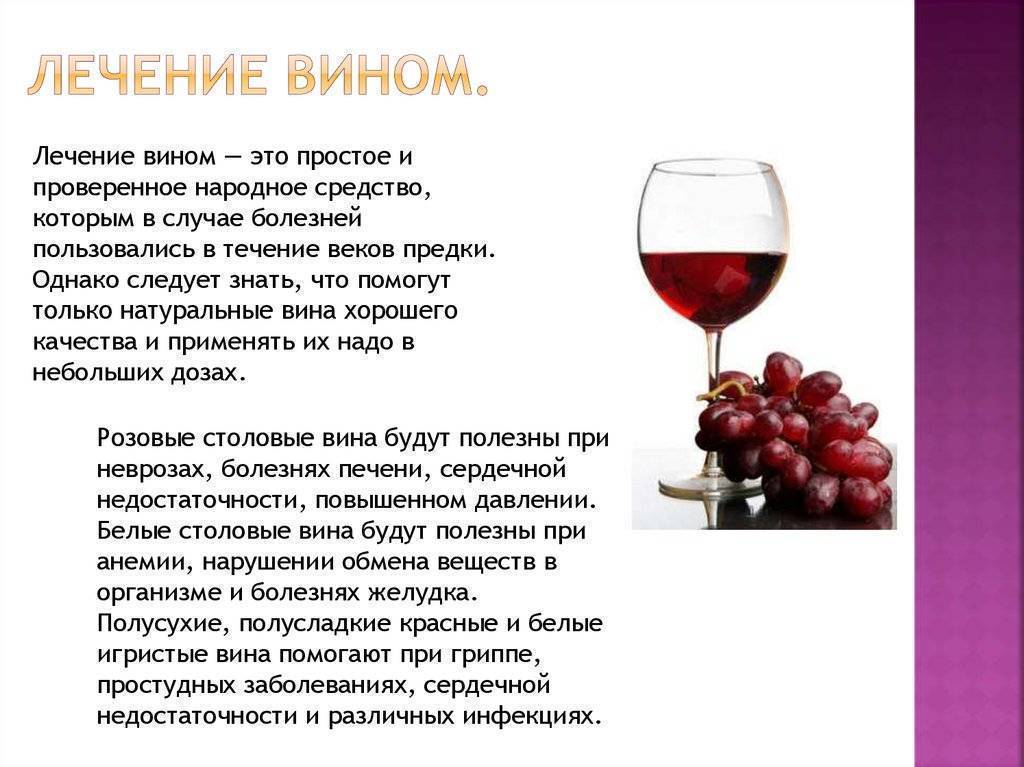 Однако это не значит, что все французы страдают алкоголизмом. Совершенно нет. Во-первых, они пьют именно вино — натуральный и полезный в разумных количествах напиток с небольшой крепостью. Во-вторых, они не пьют его помногу. И что интересно — вино находится на последнем месте среди алкогольных напитков, способных вызывать зависимость, даже у пива опасность привыкания намного больше. А пить вино по одному-двум бокалам в день — это полезно, можно проконсультироваться на эту тему с любыми врачами. Красное вино выводит из организма радиацию, также оно благотворно влияет на сердце и сосуды. Употребление вина не нарушает координацию движений и речь, не вызывает агрессивного поведения, тем более что экономные французы, как и древние греки, практически не пьют вино неразбавленным, а смешивают его с водой. Так что натуральное вино — это прекрасный напиток, который даже освящён Церковью: ведь именно красное виноградное вино, единственное из всех жидкостей, приносится в алтарь и становится Кровью Спасителя! Во Франции производят и красное, и белое вино отменного качества, и это почти единственная страна, где вы можете не бояться вместо вина купить опасный суррогат. На территории страны очень строгий контроль за качеством, но главное даже не это, а то, что в стране, которая производит 7 миллионов тонн винограда в год, совершенно нерентабельно химическим образом готовить суррогаты, намного дешевле купить винограда (пусть плохого, дешёвого — но натурального!) и сделать вино из него. Вот почему даже «плохое» французское вино является прекрасным по своему составу и воздействию на организм, и уж точно ни в одной стране мира вы не купите за 1-2 евро такое вино, которое на самом деле вино, а не смесь воды со спиртом и красителем. Мы же поговорим о тех винах, которые пользуются во Франции и за её пределами наибольшей популярностью.