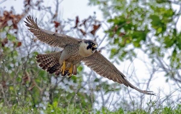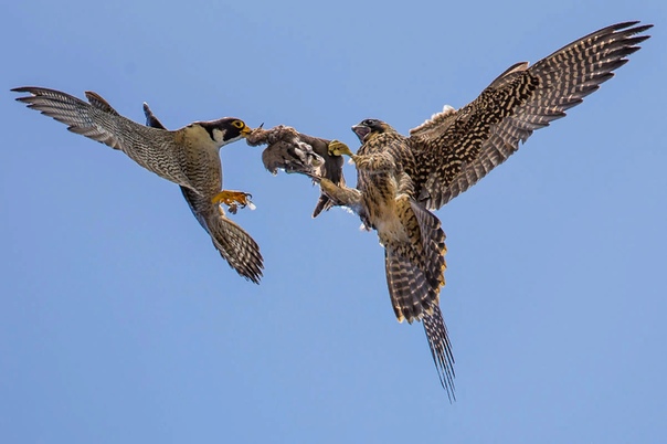Сокол закрывает ноги и сбивает ими добычу с неба.