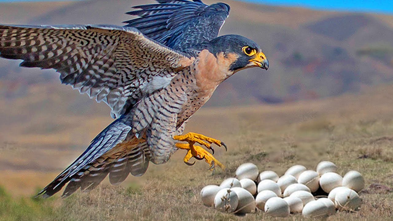 Сокол закрывает ноги и сбивает ими добычу с неба.
