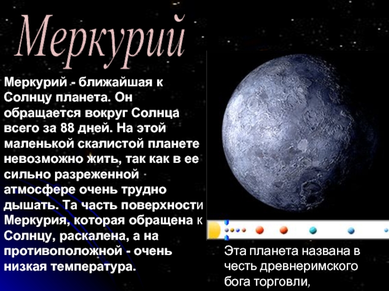 Меркурий — одна из девяти планет, входящих в солнечную систему. Она располагается ближе всех к нашей звезде, и обладает самым маленьким размером среди четырёх планет до пояса астероидов. Меркурий назван именем древнего бога торговли — быстроногого Меркурия, так как эта планета перемещается по небесной сфере быстрее остальных. Не имеет естественного спутника и имеет схожесть с нашей луной.