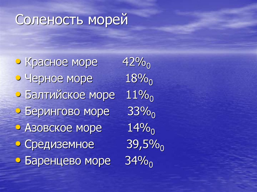В классификации мировых водных объектов есть и такой подход, при котором моря распределяются на категории по степени солености воды. Мировой океан наполнен различными солями, попавшими в него из размытых прежде горных пород. Общее содержание твердых веществ, растворенных в одном килограмме воды, принято называть соленостью. Ее уровень выражается в промилле (десятых долях процента).