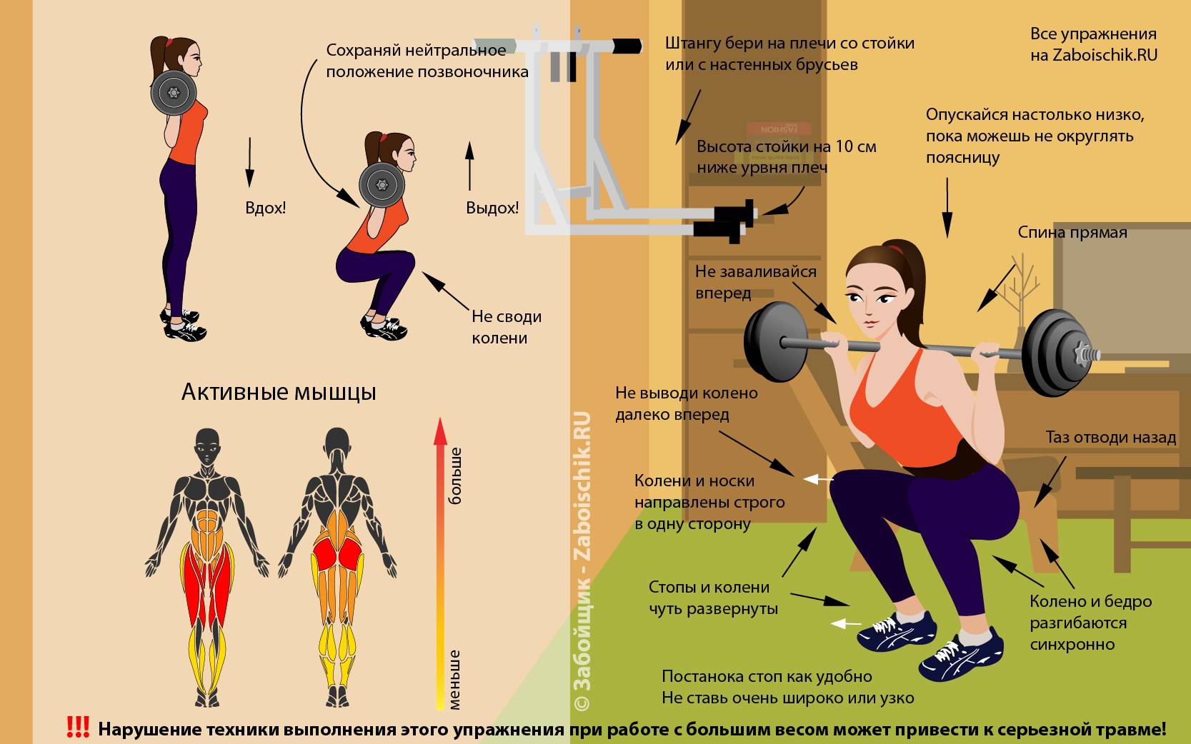 Приседания со штангой для девушек выполняются из позиции ноги на ширине плеч, спина прямая, носки чуть разведены в сторону, голова чуть смотрит вниз. Штанга кладется на кость лопатки, ни в коем случае не на шею. Удерживается штанга сзади руками. Приседания выполняются вниз с прямой спиной, таз отводится назад, колени не выступают за носки. Чем ниже присед, тем эффект сильнее.