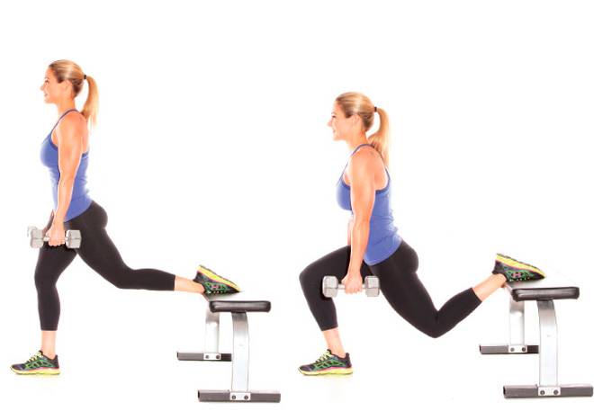 Приседания для девушек на одной ноге можно выполнить и при помощи скамьи (болгарский сплит-присед). Техника выполнения следующая: на расстоянии одного шага от скамьи становятся к ней спиной, ногу заводят назад и кладут ступню на скамью пяткой вверх. Вторая нога при этом немного сгибается в колене. Приседания делают вниз до уровня параллели с полом, учитывая, что колено не должно выступать за носок.