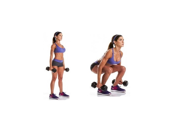 - Используя одну гантель, при этом держа ее двумя руками на уровне груди, приседания выполняют со скручиванием корпуса.