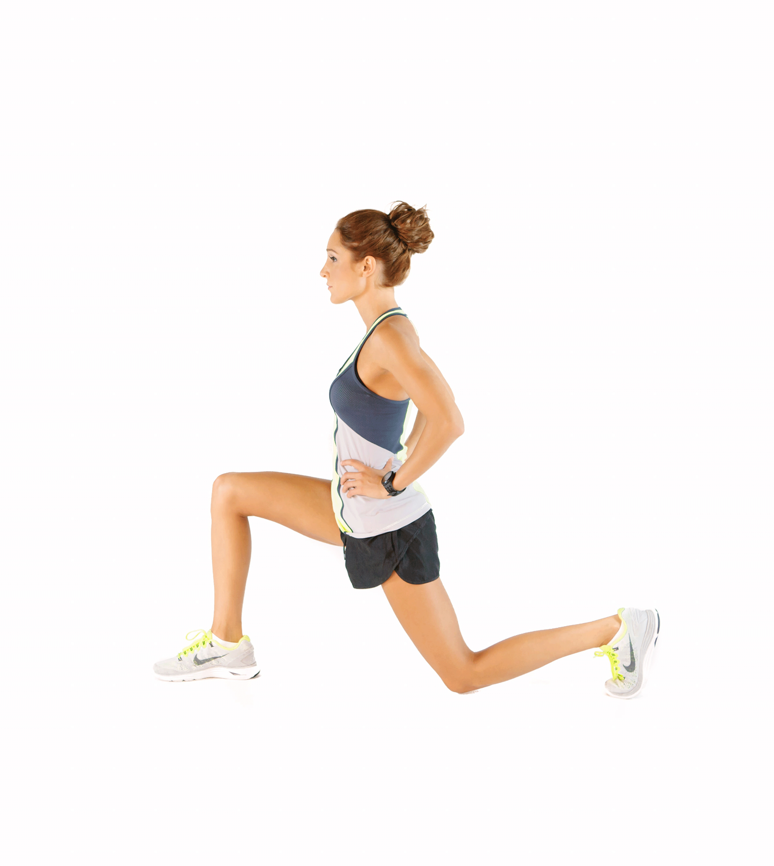 - Согните переднюю ногу и медленно присядьте до положения в 90 градусов в колене.