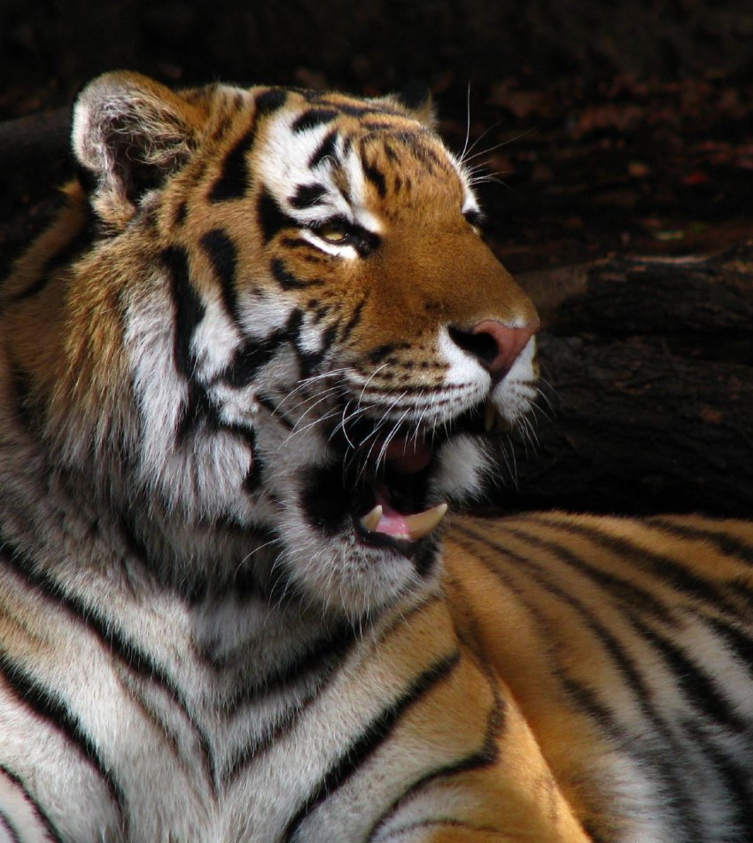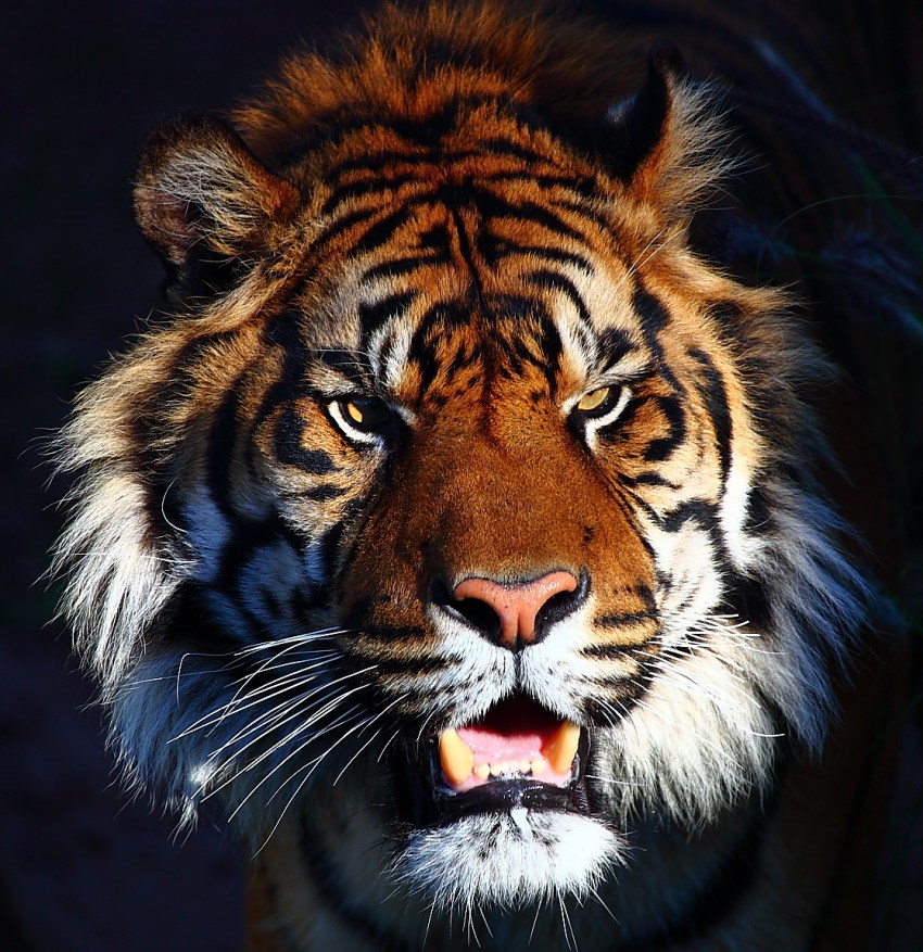 На морде тигра имеются упругие белые усы. Также у взрослого тигра в наличие 30 зубов (которыми они переживают пищу) + четыре острых клыка, по два сверху и снизу, с их помощью хищники расправляются со своими жертвами.
