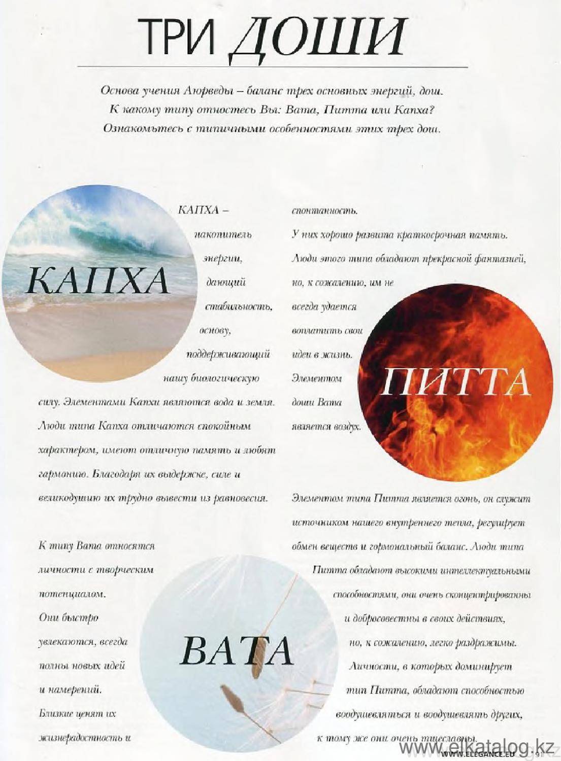 В каждом человеке есть все три доши, но обычно есть более доминирующая доша или нечто среднее между двумя дошами.Три доши (Вата, Питта, Капха) состоят из пяти элементов и представляют наши физические процессы, личность и эмоциональные черты.