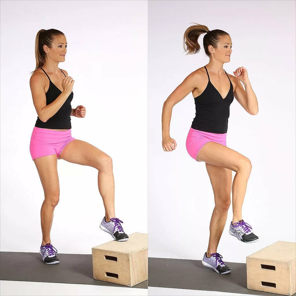 Как выполнять? Встань лицом к скамье, стулу, дивану или ящику, положив руки на талию. Выпрыгивай сначала левой ногой на возвышение, удерживая 90 градусов в колене, а затем поменяй местами ноги и повтори то же самое на правую ногу, быстро чередуя стороны.