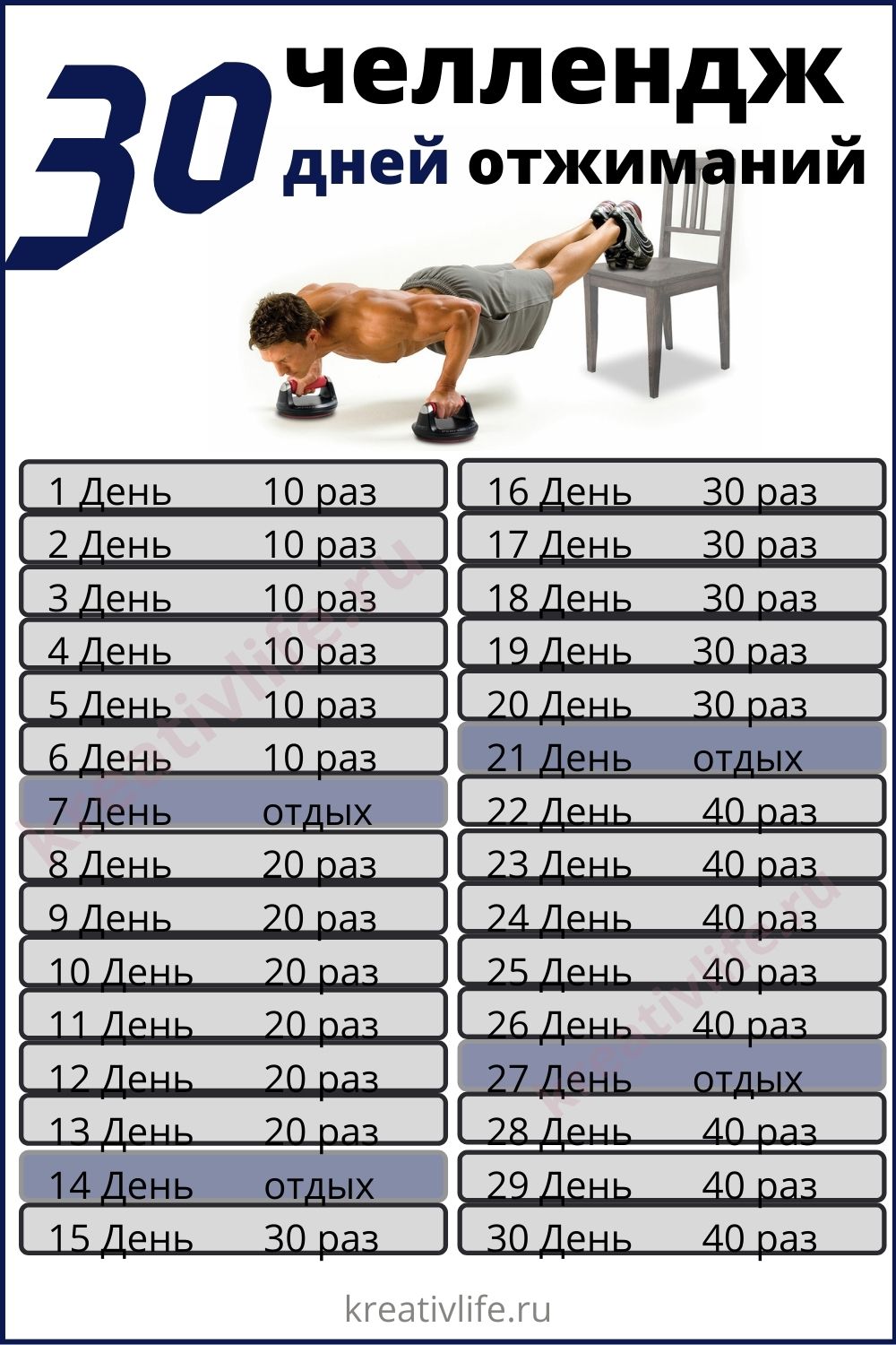 30-дневные упражнения с отжиманиямиПора освоить крутые отжимания.«Следующие упражнения помогут вам натренировать мышцы, необходимые для основного упражнения», — говорит Грей. «Эти движения помогут вашим мышцам постепенно стать сильнее и сведут к минимуму риск получения травмы». Старайтесь делать 3-5 подходов по 8-12 повторений.