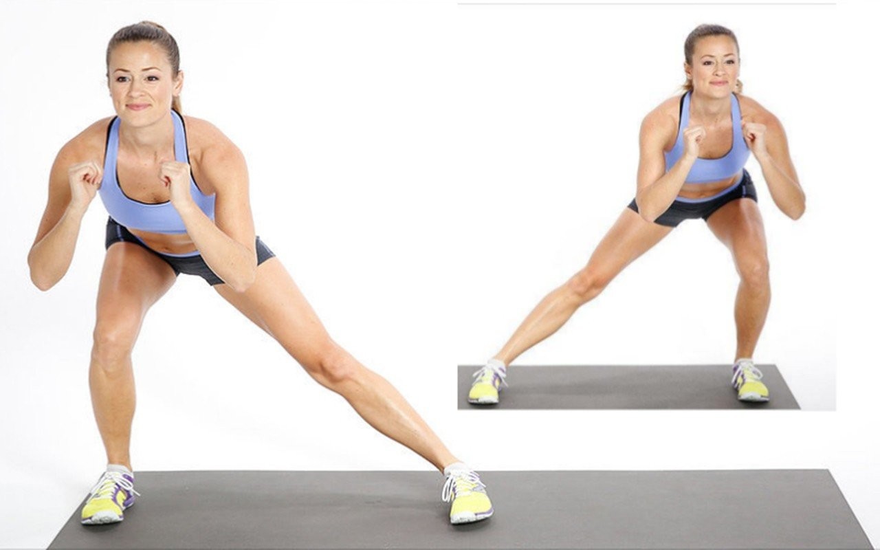 Этот вариант выпада работает в передней плоскости движения (слева направо), укрепляя внутреннюю поверхность бедер, а также ягодицы. Этот боковой выпад помогает наращивать силу и улучшает баланс каждой ноги.