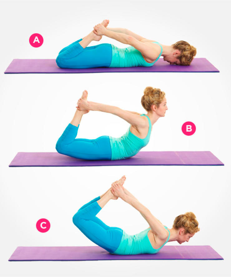 Далее, втянув живот, поднимите таз и ягодицы как можно выше и постарайтесь обхватить руками тыльную сторону стоп.