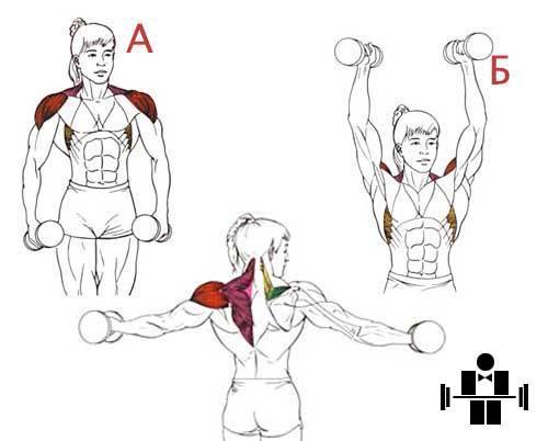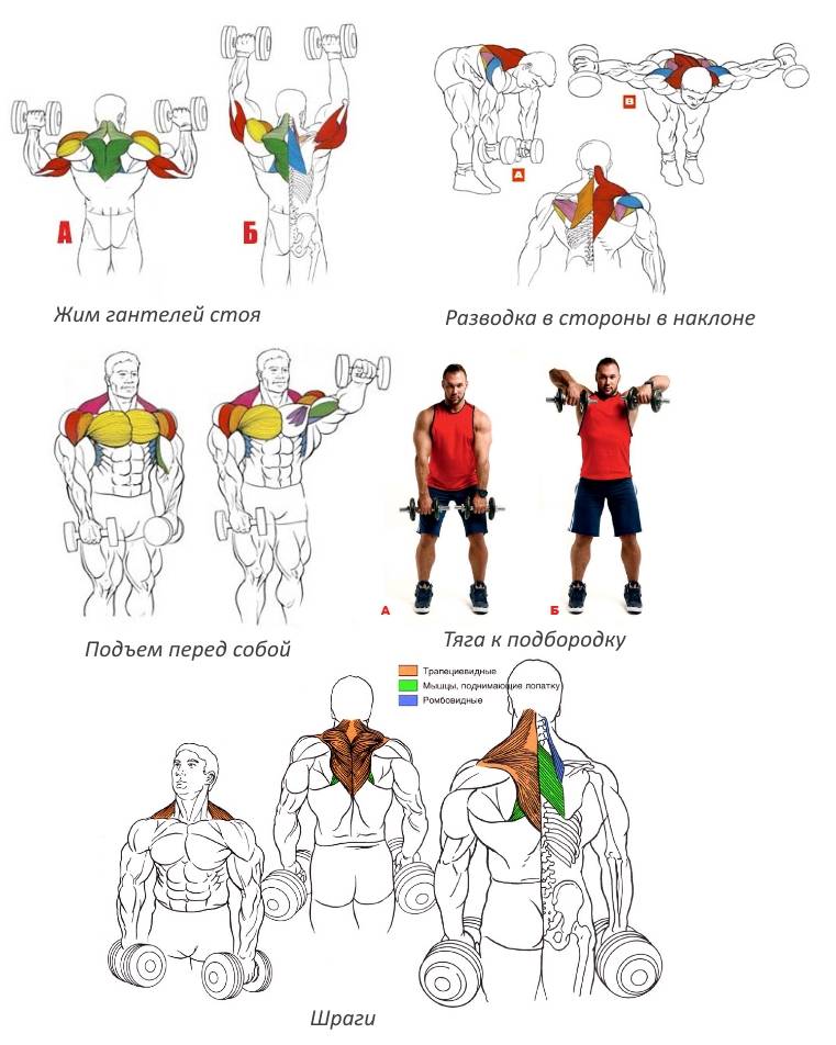 Базовым упражнением на плечи является вертикальный жим штанги или гантелей. Также для тренировки дельтовидных мышц на массу эффективна тяга штанги к подбородку (или попеременный подъем гантелей) — упражнения развивают задние и средние пучки дельт, делая спину визуально шире. Махи и подъемы в стороны, в свою очередь, придают плечам округлость и объем.