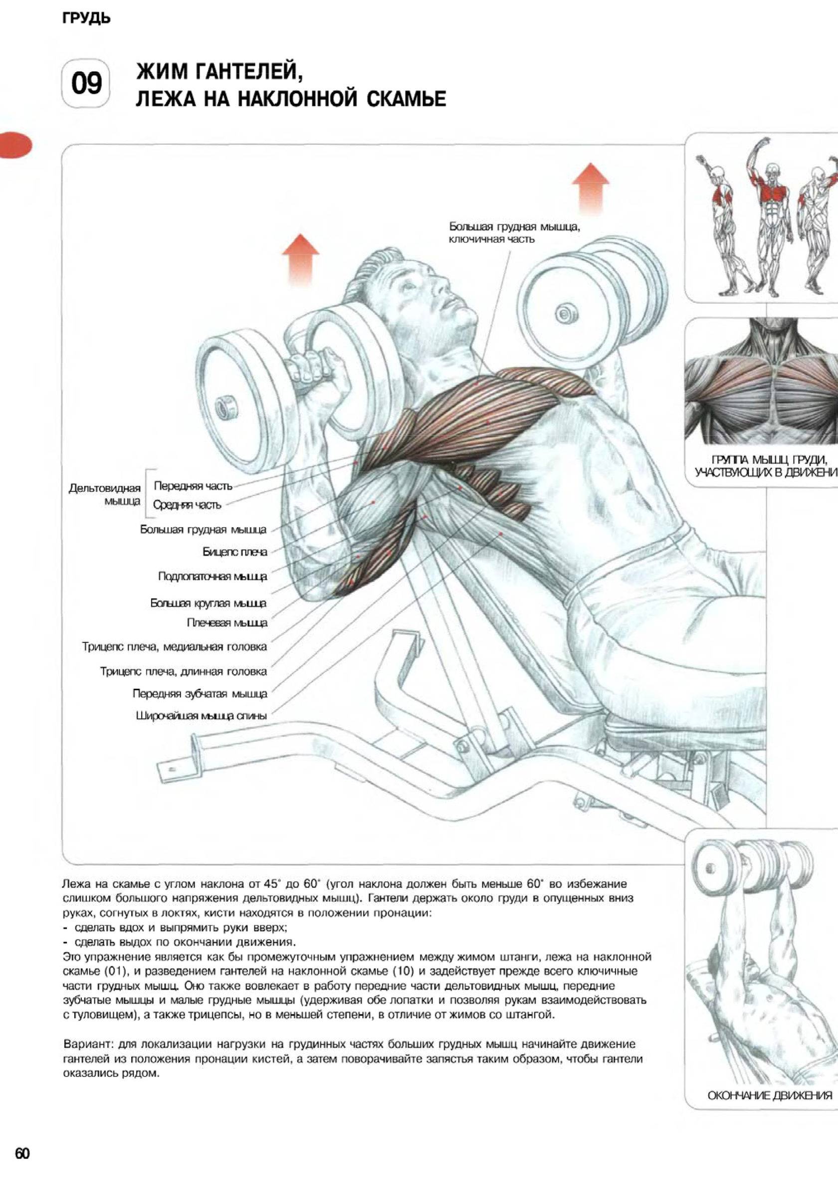 : пять способов улучшить жим лежа Жим гантелей на наклонной скамье по-прежнему нацелен на большую грудную мышцу, но с повышенным акцентом на ключичную головку (верхнюю часть груди).