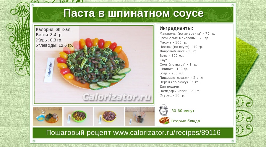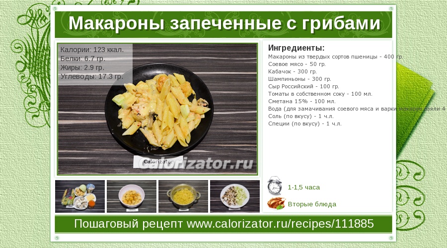 При варке макароны увеличиваются в объеме примерно в 2-2,5 раза — то есть соответственно калорийность готовых макарон будет в 2-2,5 раза меньше … При варке макарон, чтобы они не слипались , добавьте в сковороду оливковое масло – это практически не повлияет на калорийность готового блюда, зато ваши макароны не слипнутся.Еще одна хитрость, используемая в Италии, — это недоваренные макароны. Слегка недоваренные макаронные изделия имеют гликемический индекс на 20% ниже, чем предварительно приготовленные макароны.