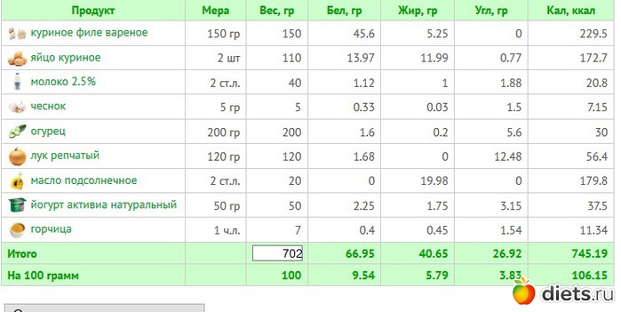 | Калорийность | 172 кКал | 1684 кКал | 10.![]() | 5.9% | 979 г |