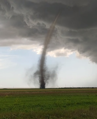 - (meteorology) A violent windstorm characterized by a mobile, twisting, funnel-shaped cloud.