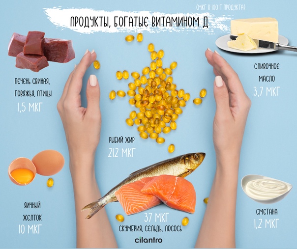 Около 50% пищевого витамина D поглощается энтероцитами и транспортируется в кровоток через хиломикроны.Часть этого витамина D поглощается различными тканями (жировой и мышечной) до того, как остатки хиломикронов и его витамин D, наконец, достигают гепатоцитов. Лучшими источниками пищи являются жирная рыба или жир из ее печени, но в небольших количествах он также содержится в сливочном масле, сливках и яичном желтке. Как человеческое, так и коровье молоко являются плохими источниками витамина D, обеспечивая только от 15 до 40 МЕ/л и одинаково минимальные концентрации 25(OH)D или 1,25(OH) 2 D. 13 Только потребление фармакологические количества витамина D (6000 МЕ/сутки) могут повысить концентрацию витамина D в молоке до уровня, эквивалентного суточной потребности младенца. 14 Потребление витамина D является плохим предиктором концентрации 25(OH)D в сыворотке у субъектов с потреблением от 2 до 20 мкг/сутки. 15,16 Очень трудно получить достаточное количество витамина D из естественной диеты.