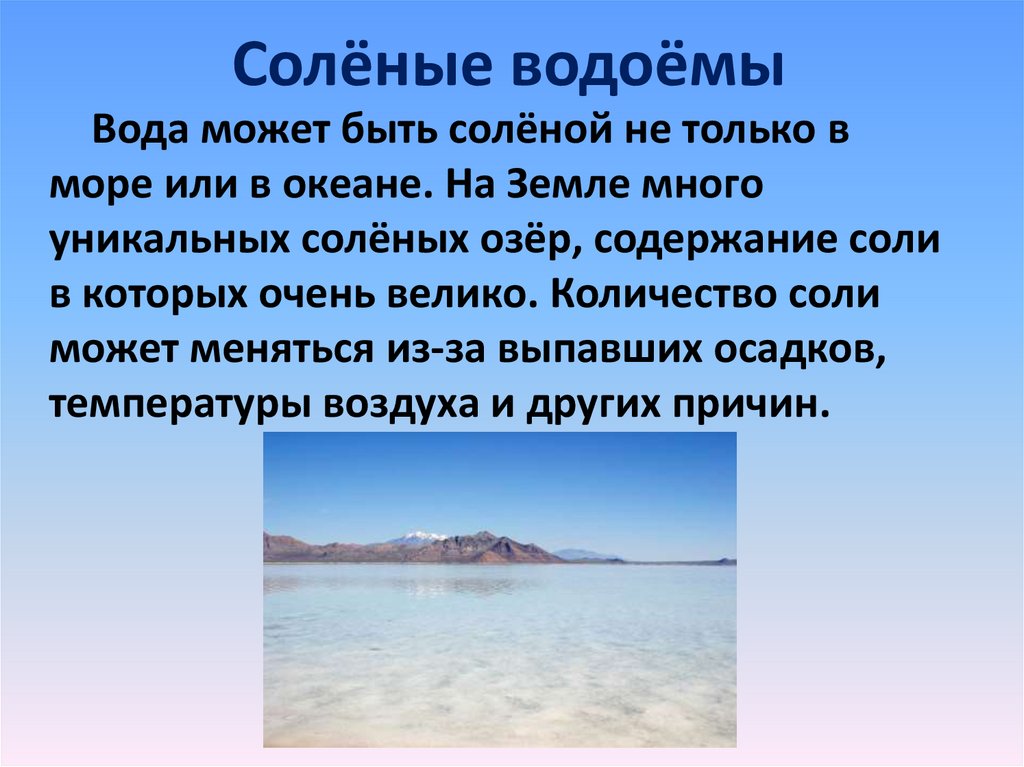ΠΠ·Π΅ΡΠ° ΠΌΠΎΠ³ΡΡ Π±ΡΡΡ ΠΏΡΠ΅ΡΠ½ΡΠΌΠΈ ΠΈΠ»ΠΈ ΡΠΎΠ»Π΅Π½ΡΠΌΠΈ, Π΅ΡΠ»ΠΈ ΠΎΠ½ΠΈ Π·Π°ΠΏΠΎΠ»Π½Π΅Π½Ρ ΡΡΠΎΡΡΠ΅ΠΉ Π²ΠΎΠ΄ΠΎΠΉ ΠΈ Π½Π° Π΄Π½Π΅ Π½Π°ΠΊΠ°ΠΏΠ»ΠΈΠ²Π°ΡΡΡΡ ΠΌΠΈΠ½Π΅ΡΠ°Π»ΡΠ½ΡΠ΅ ΠΎΡΠ»ΠΎΠΆΠ΅Π½ΠΈΡ. Π Π²ΠΎΡ Π²ΠΎΠ΄Π° Π² ΠΏΡΠΈΡΠΎΠ΄Π½ΡΡ ΠΏΡΡΠ΄Π°Ρ β Π²ΡΠ΅Π³Π΄Π° ΡΠΎΠ»ΡΠΊΠΎ ΠΏΡΠ΅ΡΠ½Π°Ρ, Ρ ΠΎΡΡ ΠΏΠΎ ΡΠ²ΠΎΠΈΠΌ ΡΠ°Π·ΠΌΠ΅ΡΠ°ΠΌ ΠΎΠ½ΠΈ Π±ΠΎΠ»ΡΡΠ΅ Π½Π°ΠΏΠΎΠΌΠΈΠ½Π°ΡΡ ΠΌΠ°Π»Π΅Π½ΡΠΊΠΈΠ΅ ΠΎΠ·Π΅ΡΠ°.