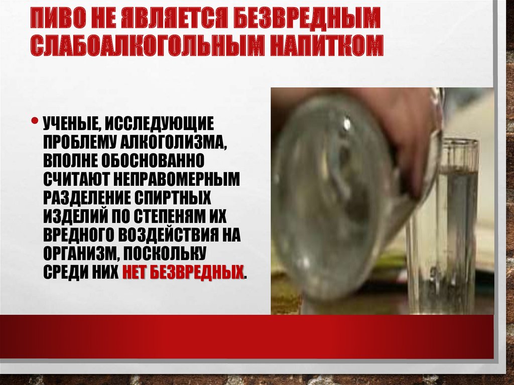 Сегодня на каждом углу рекламируют так называемое «живое» пиво. Но задумайтесь, может ли вообще существовать в природе некий «живой», безвредный алкоголь? Что делает его таким? Отсутствие консервантов? А как тогда сохраняются такие объёмы напитка в торговых точках? Натуральный солод использовать невыгодно в масштабах массового, потокового производства. Поэтому в современный напиток нередко добавляют химические заменители. Задумываясь о том, какой вред приносит пиво организму, не стоит искать оправданий или каких-то положительных моментов. Их нет ни в натуральном напитке, приготовленном на частной пивоварне, ни в популярном марочном пиве. Многочисленные болезни, жизнь, несущаяся под откос, разрушенные судьбы и семьи — всё это может быть результатом увлечения лёгким пенным напитком — пивом.