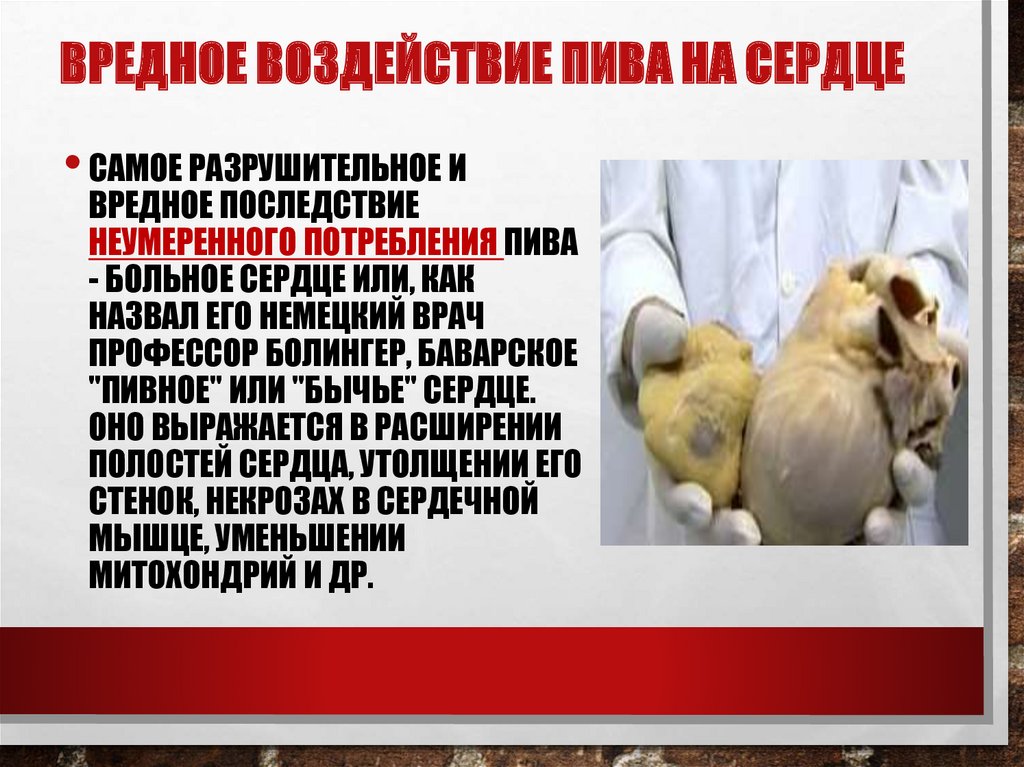 Одно из самых пагубных воздействий пиво оказывает именно на сердце. При регулярном употреблении пива происходит увеличение размеров сердца, оно становится дряблым и хуже справляется с перекачкой крови. Врачи называют такие изменения синдромом «бычьего сердца», «капронового чулка».
