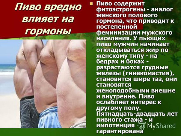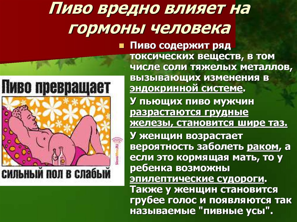 В химический состав пива входит 8-пренилнарингенин. Это вещество содержится в шишечках хмеля и относится к классу фитоэстрогенов. Эстрогены относятся к женским половым гормонам. В хмеле присутствует достаточно большой процент фитоэстрогенов, а в пиве их содержание достигает тридцати шести миллиграммов на один литр. Некоторые специалисты считают, что этого вполне достаточно для изменений в гормональном фоне человеческого организма.
