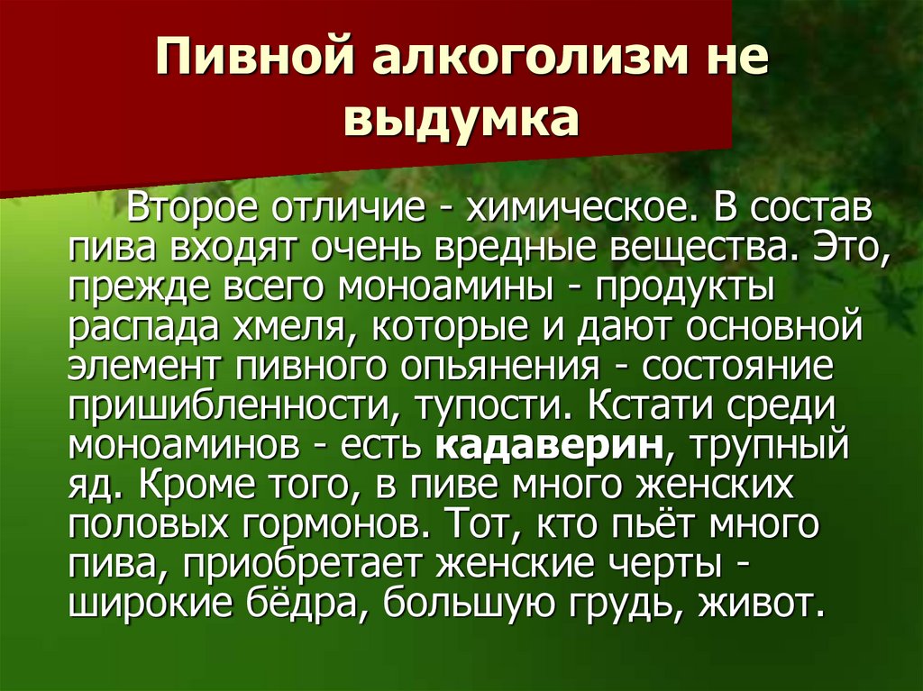 Пиво содержит психоактивные вещества, которые создают особый слегка отупляющий, опьяняющий эффект, и действует как седативное средство, который расшатывает нервную систему.