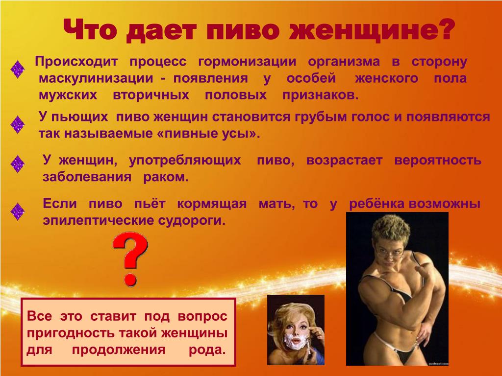 Благодаря женским гормонам, которые вырабатывает сам организм, у женщины голос мягче, фигура изящнее, отсутствует растительность на лице, да и характер более покладистый. Для поддержания женственности достаточно 0,3-0,7 мг эстрадиола, именно столько и вырабатывает женский организм. А вот пиво содержит в себе большую дозу эстрогенактивного соединения.