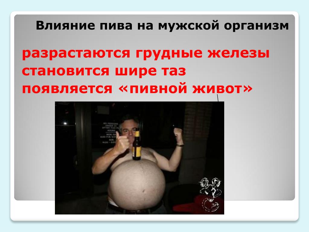 И здесь причина не в лишних килограммах. Увеличение молочной железы спровоцировано усиленным формированием женского гормона — эстрогена и подавлением выработки тестостерона. А виной тому огромное количество пренилфлавоноида, который содержится в шишках хмеля. Увеличение груди, полнота, локализующаяся в местах, характерных для женского тела, — это ещё не все беды, которые приносит мужскому организму частое употребление пива. Мужское бесплодие часто имеет в основе проблему тяжёлой зависимости от лёгкого алкогольного напитка.