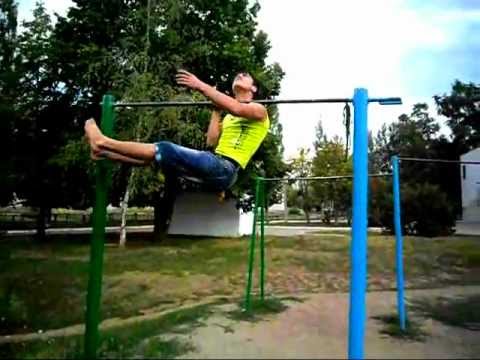 Выполните отжимание от перекладины, а затем согните руки в локтях и снова опуститесь под турник, набирая инерцию для следующего выхода.
