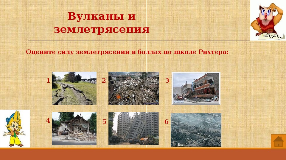 6 баллов — Качаются висячие предметы. Иногда падают с полок и сдвигаются картины. Маятники многих стенных часов останавливаются. Легкая мебель сдвигается. Падает посуда. Многие люди выбегают из помещений, передвижение людей неустойчивое. Животные выбегают из укрытий.