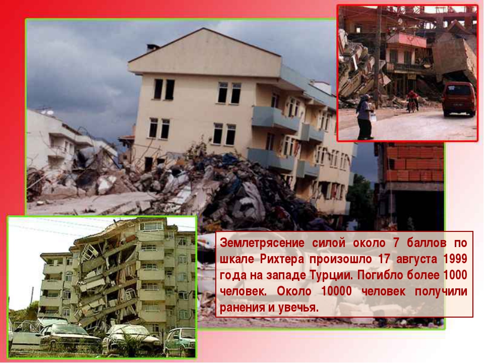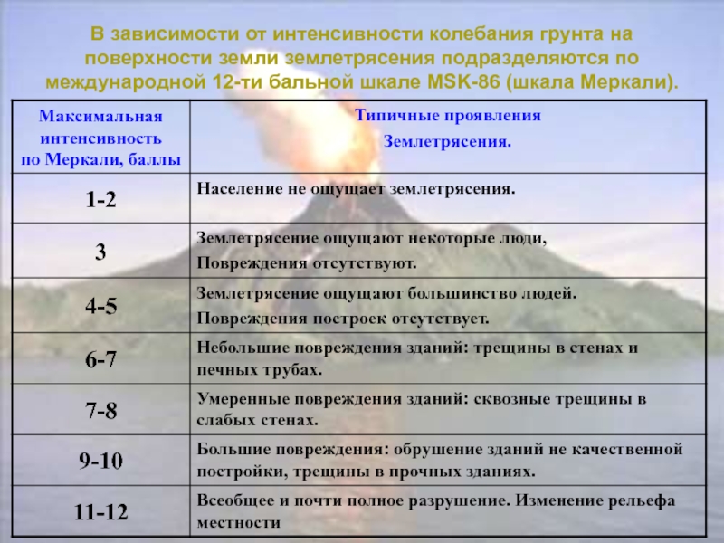 12 баллов — Сильная катастрофа с человеческими жертвами. Растительность и животные гибнут от обвалов и осыпей в горных районах.