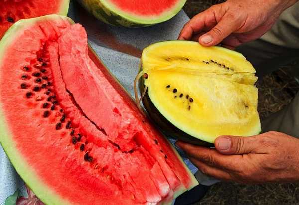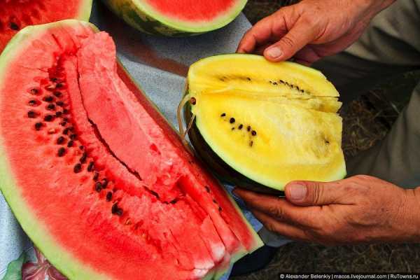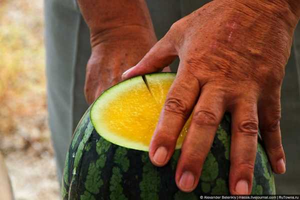 Да просто он внутри желтый. Этот эксклюзивный сорт арбуза выведен несколько лет назад именно на этой ферме. «Лунные» арбузы отличаются окрасом, меньшим размером и немного другим вкусом: