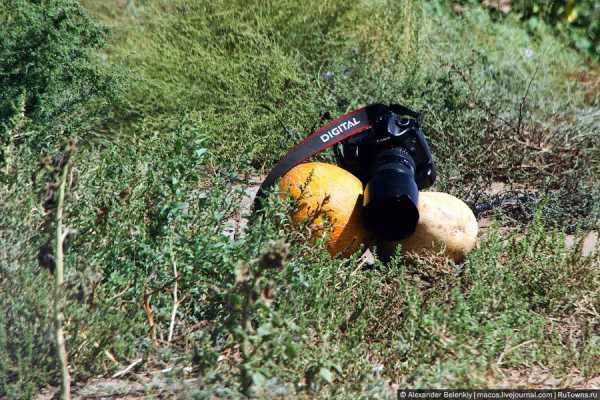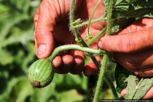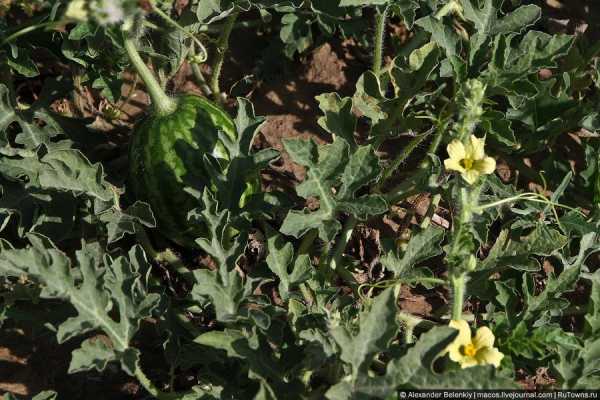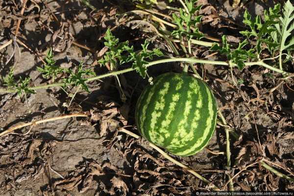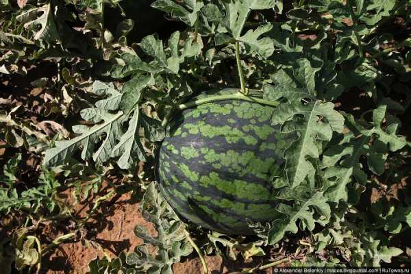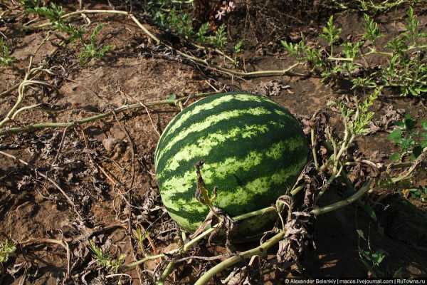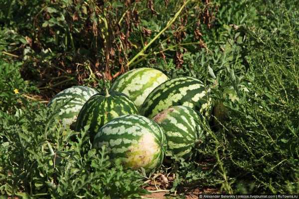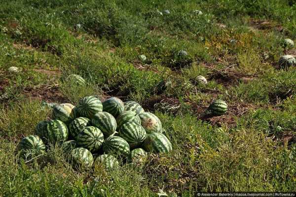Растут арбузы почти как огурцы. Поля называются бахчами, на которых тянутся по земле длинные плети.