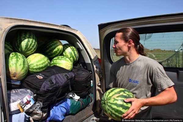 Сотрудники колхоза «Заречный» приготовили для нас подарок — четыре огромные горы арбузов. Мы забили всю машину арбузами, влезло всего две горки — около 30 штук. Три из них погибло при транспортировке, один был кому-то подарен, а остальные поделены с учетом пожеланий команды: