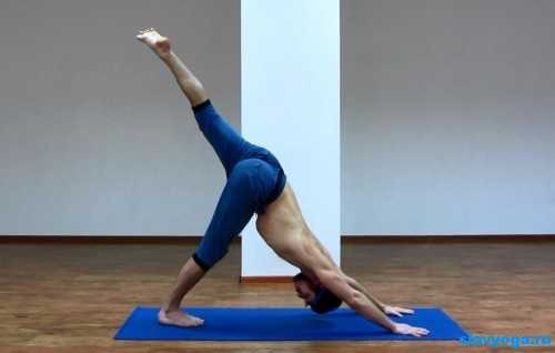 Техника: примите позу собаки (руки и ноги прижаты к полу, копчик в максимально возможной точке наверху), после чего согните правую ногу в колене и заведите за спину в левую сторону (левую ступню нужно развернуть). Затем оторвите правую руку от пола, правую ногу поставьте на носок за спиной, а руку вытяните за голову.
