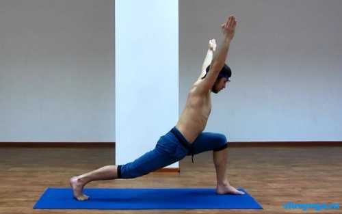 Ашвасанчаласана (выпад) – выдохните, упритесь ладонями в пол и перейдите в «планку» (поза как при отжимании). Вдохните и, согнув одну ногу в колене, поставьте ее вперед, голову нужно поднять наверх.