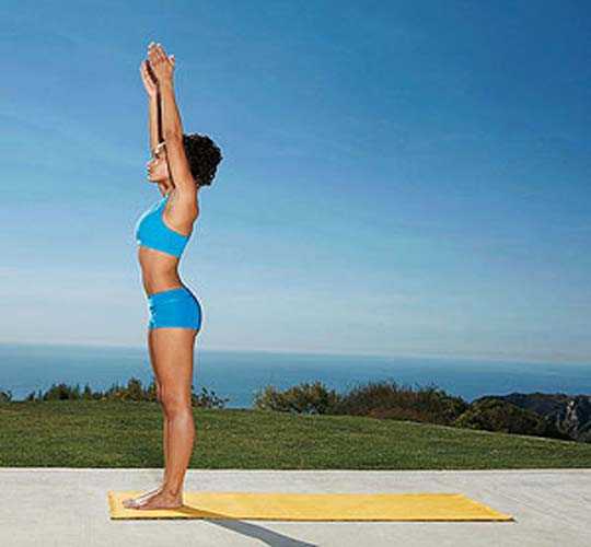 Урдхва хастасана (поза с руками наверх) – вдохните и поднимите руки наверх, сложив ладошки вместе. Останьтесь в таком положении, слегка тянитесь руками еще выше, чувствуйте свой позвоночник, пытайтесь вытянуть его, а затем на выдохе опустите руки. Повторять это движение стоит не менее трех подходов.