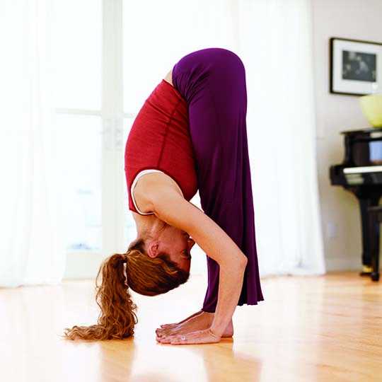 Пада хастасана (уттанасана) или наклон вперед. Выдохните и наклонитесь вперед, если возможно достаньте ладонями до пола. Не следует сгибать ноги в коленях, «повисните», стараясь расслабить спину.