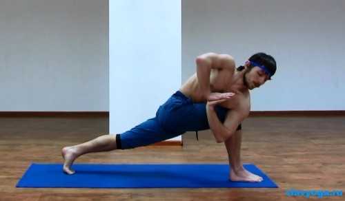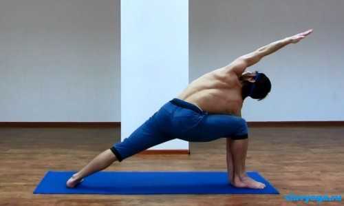 Если все делать правильно, то вряд ли получится сразу поставить ладонь на пол, поэтому можно располагать руку на специальном блоке или на ноге, но ни в коем случае не опираться на колено. При боли в шее можно развернуть голову прямо.