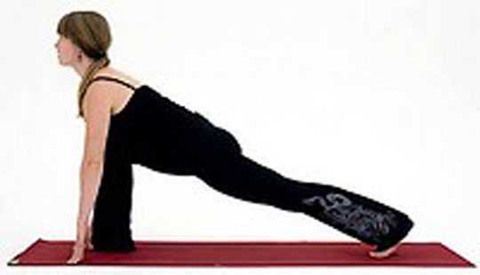 Чатуранга дандасана похожа на отжимания, но очень медленные. Вдохните и из «планки» опуститесь на руках как можно ниже, останьтесь в таком положении, после чего выдохните и вернитесь в исходное положение. Повторить три раза.