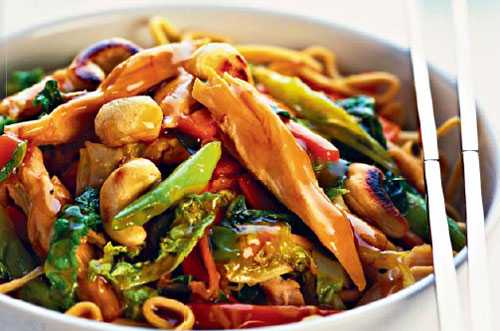 Обжарить на масле чеснок в течение нескольких секунд. Потом можно поочередно добавлять овощи. Процесс приготовления овощей займет не менее пяти минут. В самом конце добавляем сахаразаменитель, соль и соус. При подаче можно украсить луком.