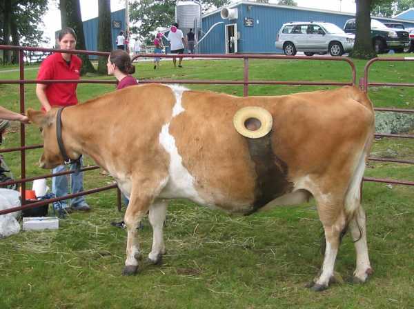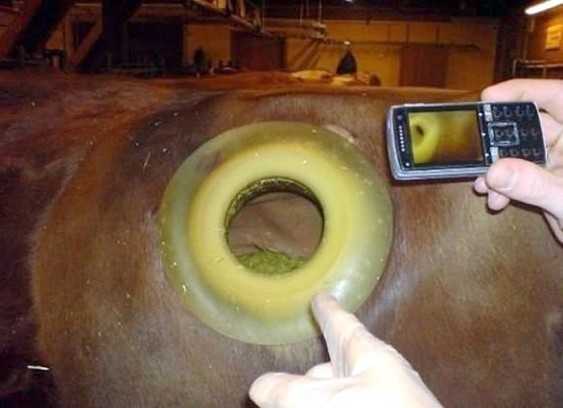 В боку каждой коровы делают отверстие и вставляют в него cпециальную трубку, которая ведет к желудку. Резиновый клапан герметизируют специальной пробкой. Это позволяет фермерам и ветеринарам, которые ухаживают за животным, тщательнее контролировать процесс пищеварения и подбирать соответствующую диету каждой корове. Кроме того, через этот клапан можно без труда убрать часть избыточного корма и выпустить излишек газов.
