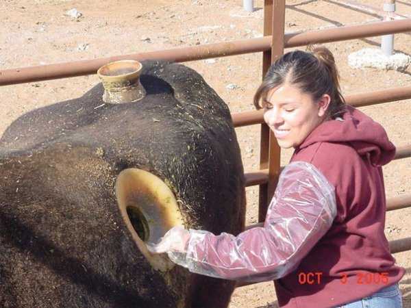 Такие фистулы в желудке широко применяются при исследованиях пищеварения крупного рогатого скота, начиная с проверки новых пищевых добавок, кончая определением роли, которую играют в пищеварении разнообразные энзимы. «На левом боку коровы имеется пробка сантиметров пятнадцать в окружности, — объясняет Дэн Сенерт, заведующий животноводческой фермой университета Калифорнии в Дэвисе. — Это несложно. Вы просто вынимаете пробку и засовываете руку внутрь».