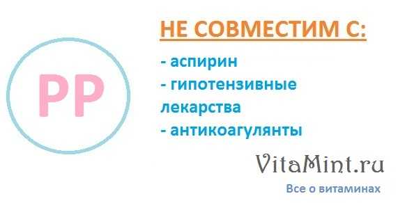 Витамин РР не очень совместим с гипотензивными лекарствами, ацетилсалициловой кислотой (аспирин) и антикоагулянтами.