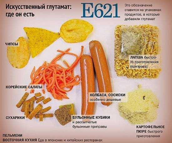 В природе вещество Е621 содержится в белках, поэтому и сочетается с ними прекрасно. Эту добавку можно встретить сейчас в очень многих продуктах: в колбасе вареной и копченой, в сухариках, в чипсах, в мясе копченом и вяленом, рыбе и птице и т.д.Для привлечения посетителей рестораны быстрого питания закупают 60% глутамата натрия от общего производства и ко всем мясным продуктам и блюдам из мяса добавляют это вещество.
