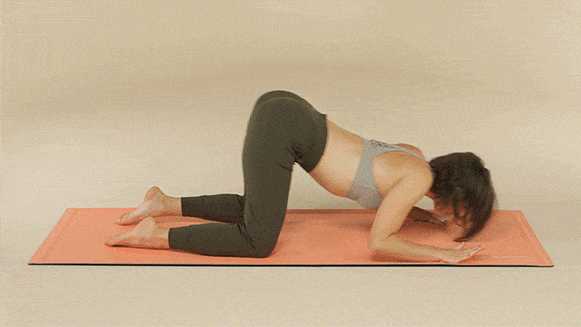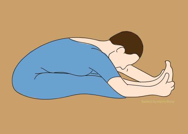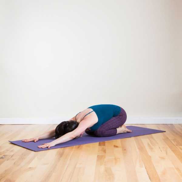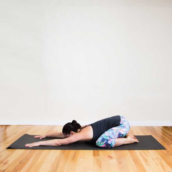 Примите положения сидя ягодицами на пятках. Плавно наклоните тело вниз, на бедра. Руки вытяните вперед. Вы почувствуйте, как выпрямляется позвоночник и уходит напряжение с шейного отдела.
