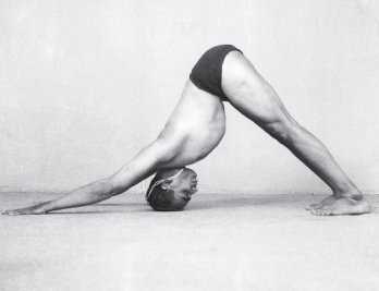 Займите положение стоя. Ноги слегка расставлены. Опустите корпус вниз, касаясь ладонями вытянутых рук пола. Отведите ноги назад на несколько шагов. Голова опущена вниз. Ваше тело приобретет форму треугольника. Нагрузка при этом равномерно ложится на ладони и ступни. Хорошо в этом положении снимается общая усталость и напряжение.