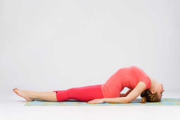 Ляг на спину. Помести руки под бедра. Медленно поднимай грудь вверх, запрокинув при этом назад голову. Дыши размеренно. Так же медленно опустись вниз.